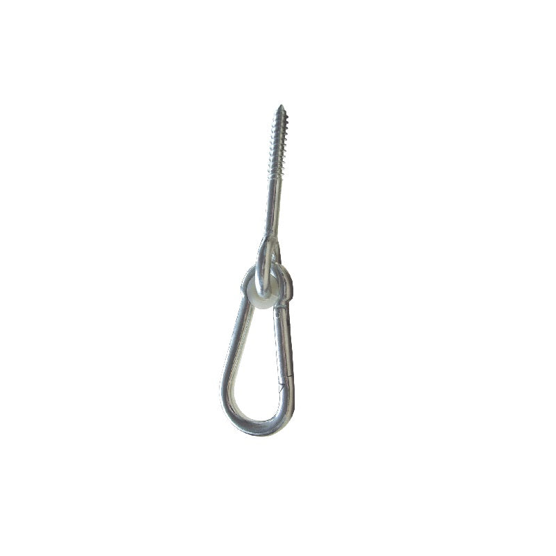 Jumbo karabinkrok/festeskrue for hengekøyer eller hengestoler. Galvanisert festeskrue som ikke vil ruste når den først er montert. Det følger også med en grå veggplugg for montering i murverk.